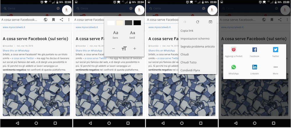 Dopo potrete leggere attentamente, scorrere e chiudere, salvare il contenuto offline (doppio tap sul link o tasto apposito), sistemare il colore di sfondo, il font e la dimensione dei caratteri per ottimizzare la lettura, copiare il link o condividerlo con altre app (qui torniamo dopo…). Tutto molto veloce e leggero.